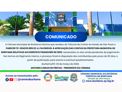 Pauta de Matérias da Sessão Ordinária da Câmara Municipal de Buritama, a ser realizada na segunda-feira, dia 02 de março de 2026, às 19h00.