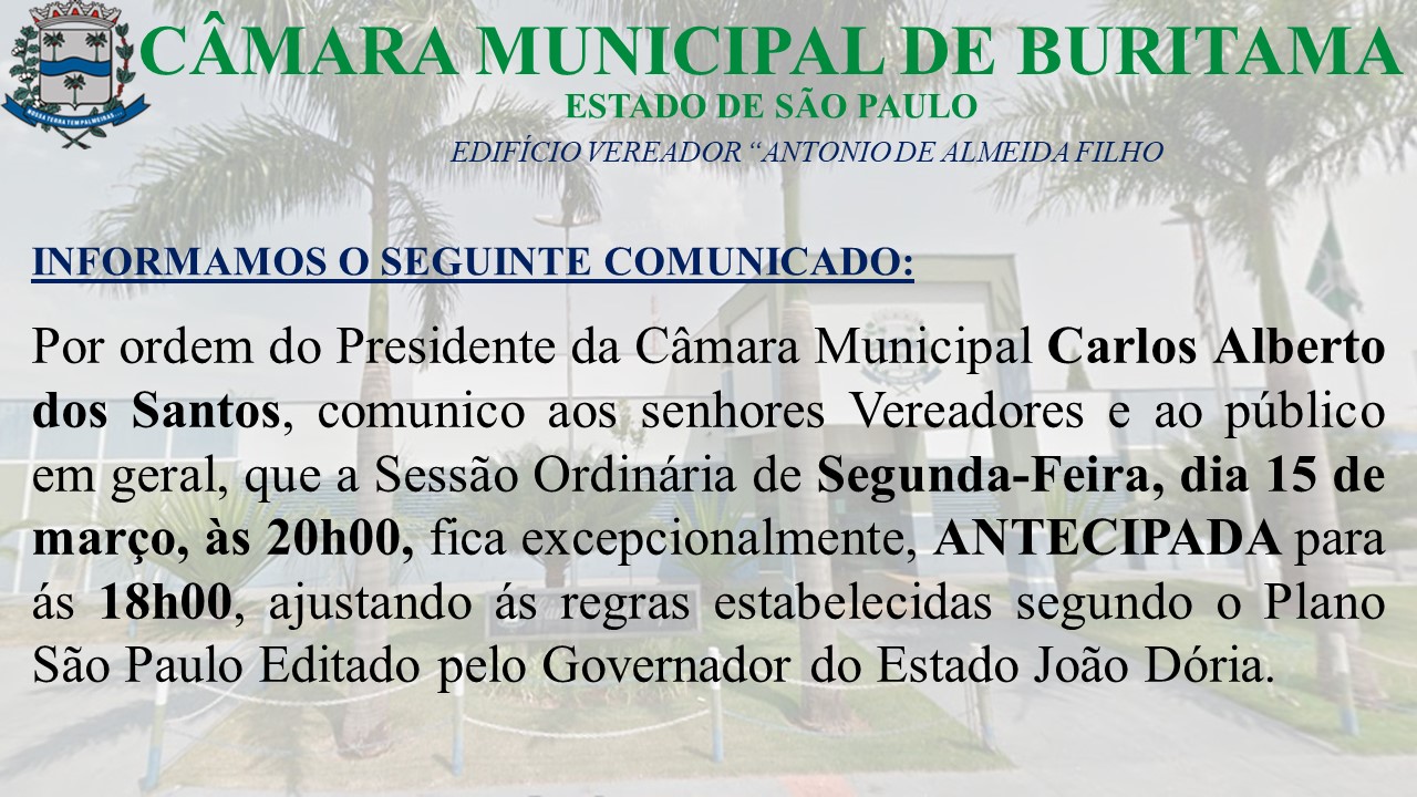 INFORMAMOS AO PÚBLICO, O SEGUINTE COMUNICADO SOBRE A ANTECIPAÇÃO DA SESSÃO ORDINÁRIA DO DIA 15/03/2021